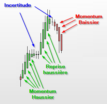 Une bougie à verte à fond plat indique que le prix n'a jamais reflué en dessous de la moitié du dernier chandelier.